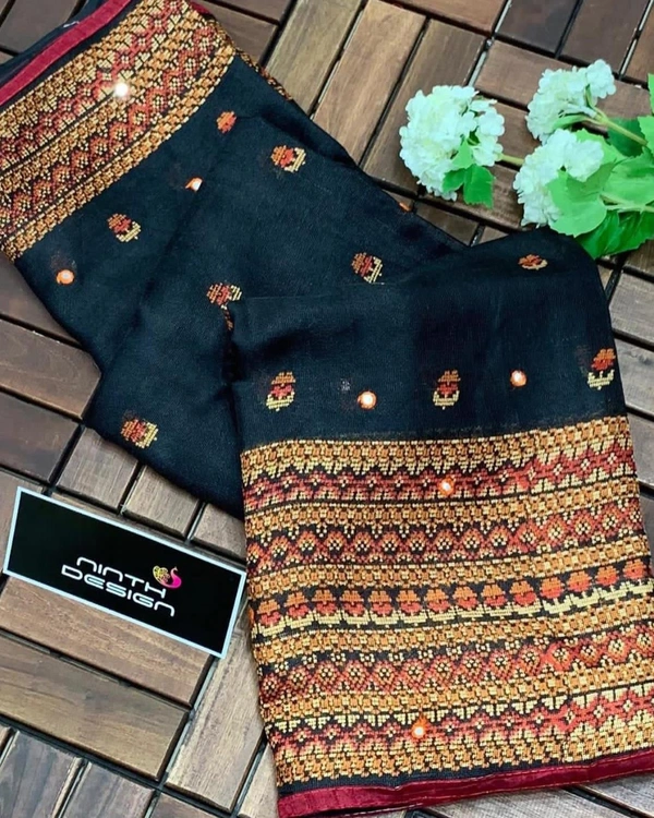 [ beautiful HD print and foil mirror work and contrast lace border and attractive latkan on pallu ]