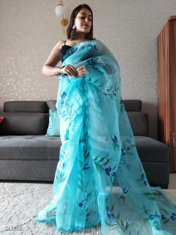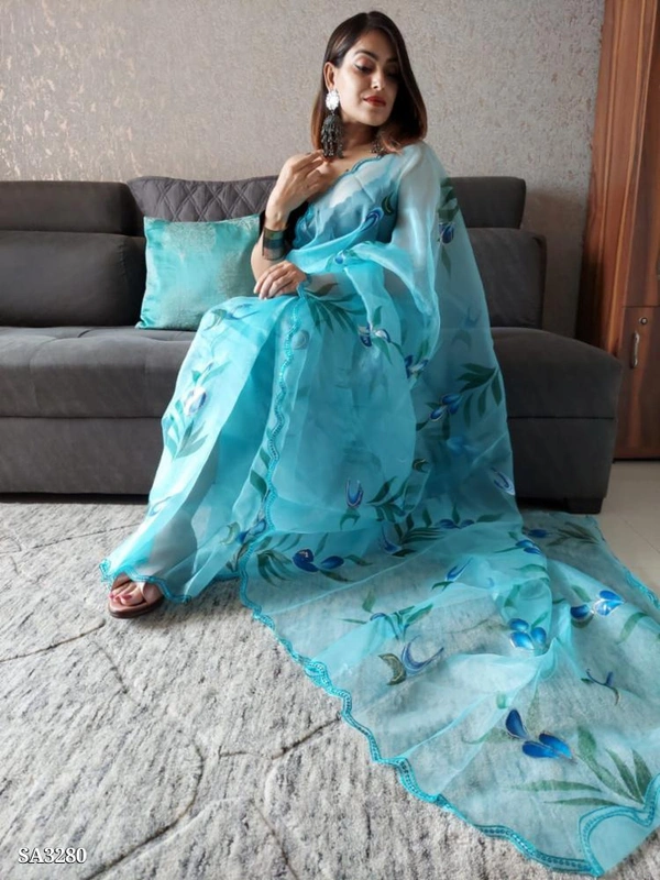 \n*Suman Soft & pure organza silk saree with beautiful handbrush prints nd foil outing nd fancy sequence aarco...